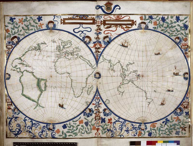 "First map of Australia" by Nicolas Vallard. Originally drawn in 1547 it is claimed this map shows the east coast of Australia with south orientated to the top.