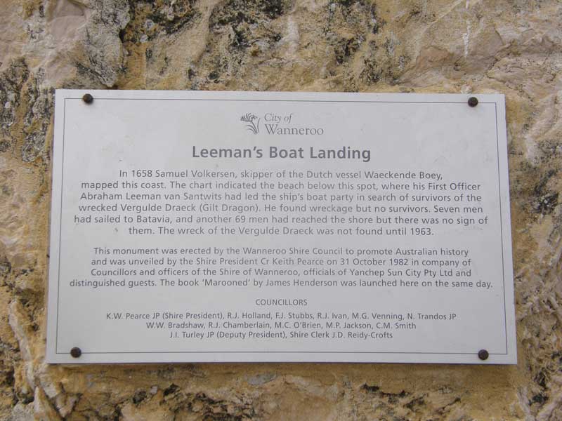 Abraham Leeman van Santwitz was an Englishman from the town of Sandwich, who joined the Dutch East India Company in the 17th Century, with many others from various countries. On 1st January 1658 Leeman sailed from the Java port of Batavia as uppersteersman (navigator and 1st officer) on the Dutch sailing ship Waeckende Boey (under command of Samuel Volkerson), which was sent with another, smaller ship, the Emeloort (under command of Aucke Pieterszoon Jonck), to search for the 68 survivors of the Vergulde Draeck (Gilt Dragon) which had been wrecked off the western coast of New Holland in April 1656. The Waeckende Boey and the Emeloort became separated on their voyage from Batavia to the WA coast, and the Waeckende Boey came in near Rottnest Island on 23rd February 1658 and then turned north. Somewhere near Yanchep, Leeman went ashore with 13 sailors in the ship's boat to begin the search for the Vergulde Draeck castaways. They stayed ashore overnight and walked up the beach, and soon found wreckage obviously washed ashore from the shipwreck.