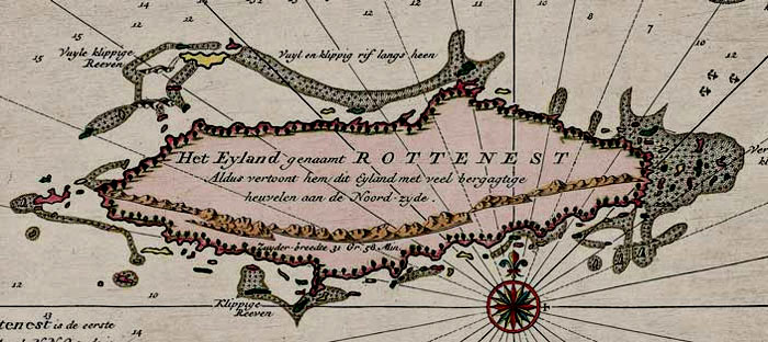 Leeman and the boat crew went ashore at various points as the ship and the boat sailed up the coast. The Emeloort met up with the Waeckende Boey on 28th February but the two ships were soon separated again in rough weather, which sent the Waeckende Boey down as far as Rottnest. Leeman went ashore on that island and explored it, and then the ship sailed north again to resume its search for the Vergulde Draeck survivors. At sunset on 22nd March, Leeman and the boat crew were sent ashore again despite his protests that a storm was developing. They were unable to sail through the lines of reefs about three miles offshore and were driven northward, while the Waeckende Boey sailed far out to sea in the storm. Next day Leeman and his 13 crew were blown many miles further north on to an island. A couple of days later they repaired the damaged boat and sailed back south to look for their ship, but could not find it, so they went to an island to wait in case it returned for them (Green Island?). About Sunset on 28th March Leeman's boat crew saw their ship sailing towards the island. It fired a cannon and they lit a fire ashore as a signal, but the ship did not stop. It sailed away in the darkness and continued to Batavia.