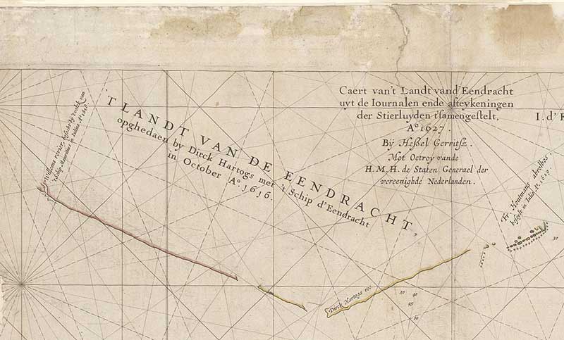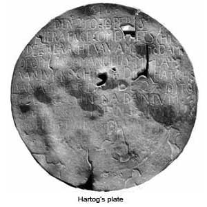 The Eendracht was part of a fleet which had set sail from Texel in the Netherlands on 23rd January 1616. Though the ship's log has since been lost, Hartog's personal letters indicate that, on 25th October 1616, he came across a string of uninhabited islands beyond which was a vast mainland. He went ashore on one of them - Dirk Hartog Island, named later in his honour - and high on the cliffs of Cape Inscription at Shark Bay, recorded his visit on a flattened pewter plate, which he nailed to a post before sailing away. The translation of the inscription reads: "On the 25th of October there arrived here the ship "den Eendracht" of Amsterdam supercargo Gilles Miebas of Liege; Skipper Dirck Hatichs of Amsterdam. She set sail again for Bantam on 27th do. Sub cargo Jan Stins; Upper steersman Pieter E. Doores of Bil. Dated 1616". A replica of the plate is on display at the WA Maritime Museum, Fremantle.
