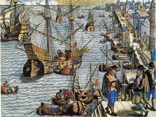 Le port de Lisbonne. Gravure de Theodore de Bry. 1595.