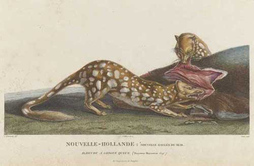 New Holland: New South Wales. Spotted-tail quoll. "A Voyage of Discovery to the Southern Hemisphere" by Francois Peron and Louis Freycinet. L'Imprimerie Imperiale, Paris 1807-16. Charles-Alexandre LESUEUR. Jean Dominique Etienne CANU