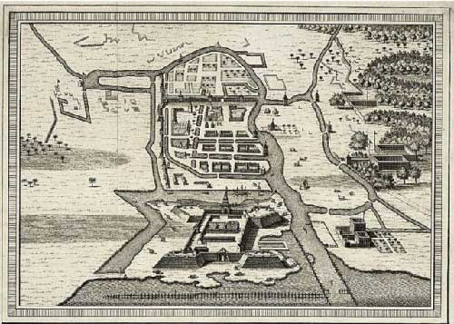 The welcome arch out of which the stones carried aboard the Batavia was to be built, is clearly visible (front foreground) on this sketch of Batavia Citadel