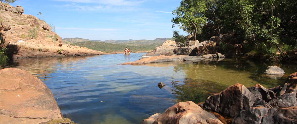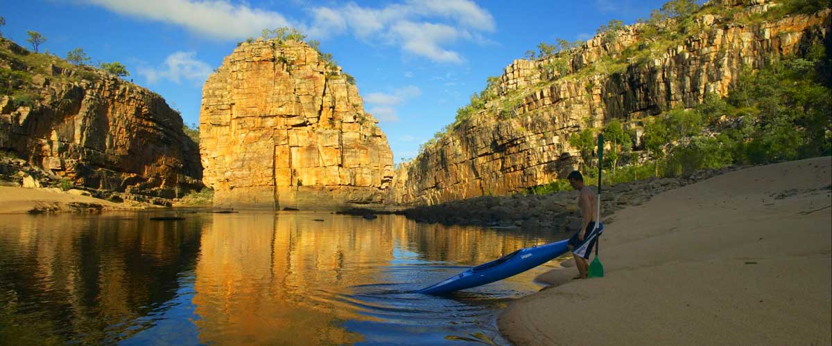 Katherine Gorge, a deep gorge carved through ancient sandstone by the Katherine River, is made up of thirteen gorges, with rapids and falls, and follow the Katherine River, which begins in Kakadu. During the Dry, the Katherine Gorge waters are placid in most spots and ideal for swimming and canoeing. Saltwater crocodiles regularly enter the river during the Wet season, when the water levels are very high.