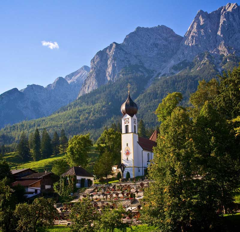 Southwest of Garmisch-Partenkirchen, the village of Grainau lies in rolling park-like countryside at the foot of the Waxenstein. Higher up is the Eibsee, from which there's a good view of the Waxenstein and the Riffelwand on the Zugspitze, as well as a gondola all the way to the summit of Zugspitze, the area's tallest peak. It's a picture-perfect slice of Bavaria, a scene made all the more perfect due to its quaint alpine homes and lovely old church.